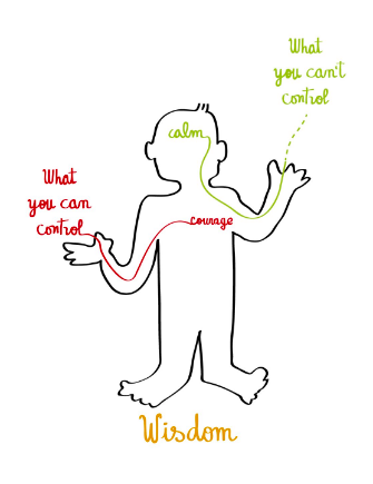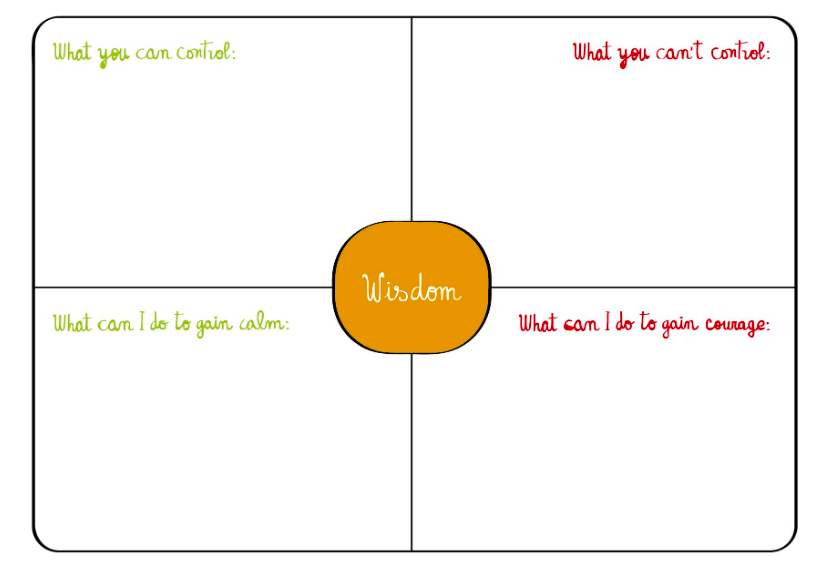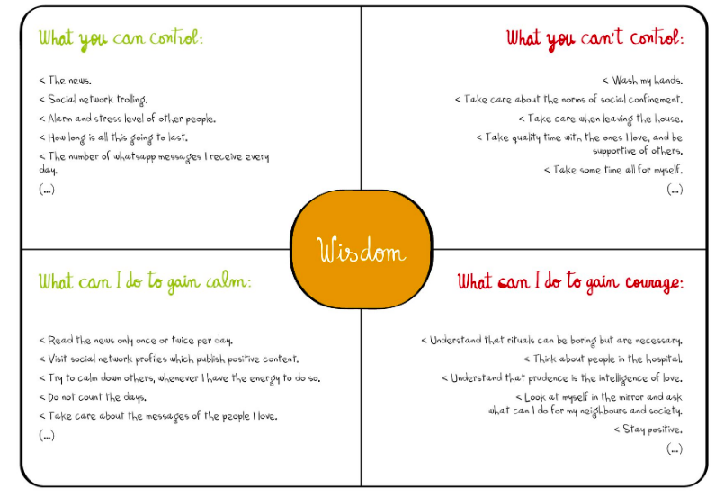 It is possible to summarize the strategy of Good Circulation of Wisdom in a scheme, where you can list all the things that you cannot control, and what you can do to get calm; and all the things that you can control, and what can be done to gain courage.