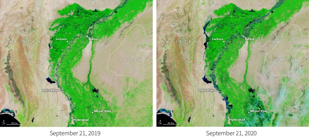 Le immagini qua sotto mostrano la provincia del Sindh del Pakistan vista dallo spazio nel settembre 2019 (a sinistra) e nel settembre 2020 (a destra), quando le forti piogge monsoniche hanno fatto esondare il fiume Indo e quasi 70.000 persone hanno dovuto essere evacuate dalle loro case. La situazione era abbastanza preoccupante da essere monitorata dallo spazio.