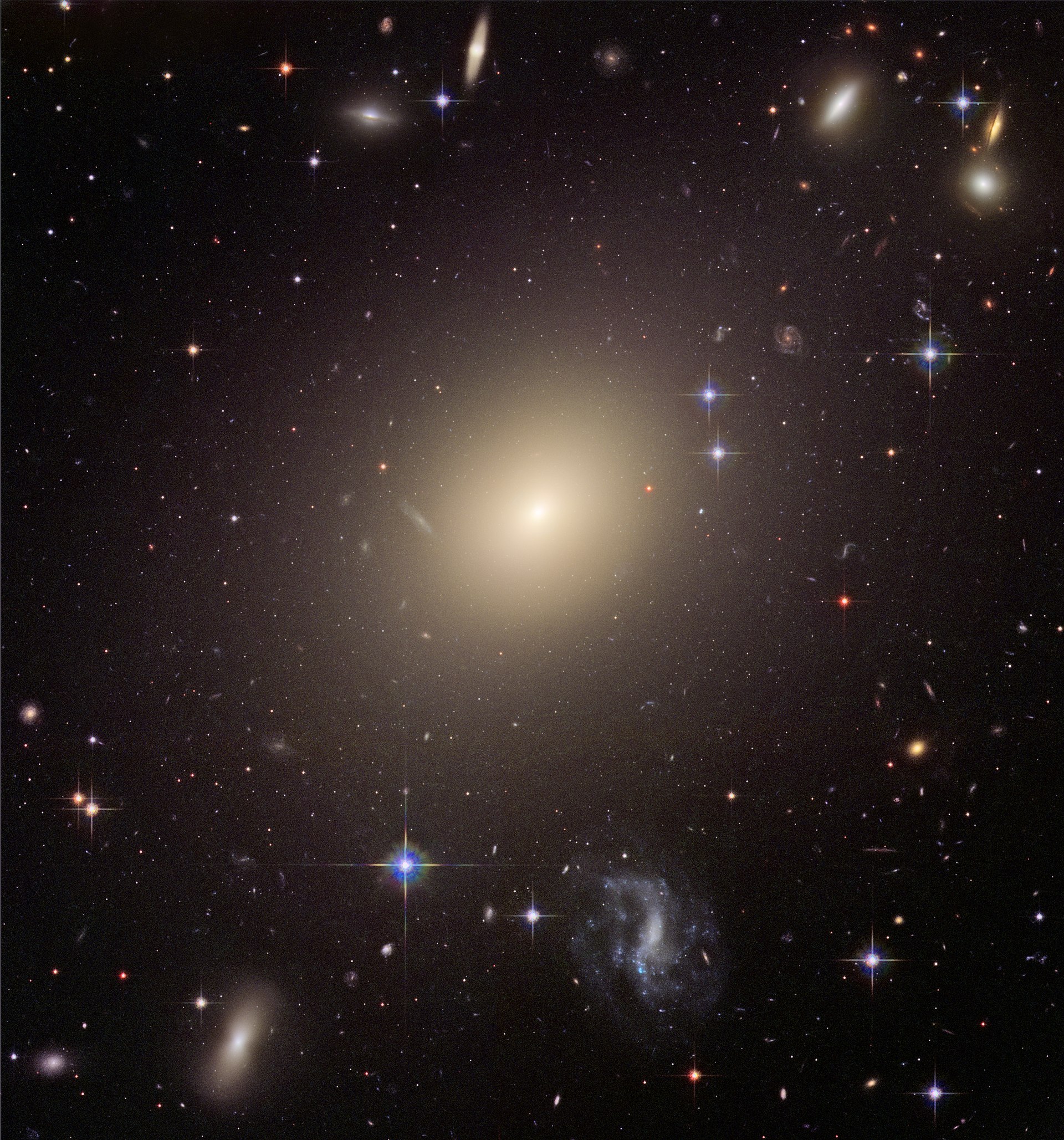 The giant elliptical galaxy M87, more than 120,000 light-years wide, is the most luminous galaxy of the Virgo Cluster, about 50 million light years away.The giant elliptical galaxy NGC 1316 (Fornax A), observed with the European Southern Observatory telescopes. This is a radio galaxy about 60 million light years away, in the Fornax cluster of galaxies. Credit: ESO.The young elliptical galaxy NGC 3610 observed by the Hubble Space Telescope. 80 million light years away, about 80,000 light years wide. Credit: ESA/Hubble & NASA; Judy Schmidt. The elliptical galaxy NGC 1132. 300 million light years from Earth, about 240,000 light years wide. Credit: M. West (ESO, Chile), NASA, ESA and the Hubble Heritage (STScI/AURA)-ESA/Hubble Collaboration.The giant elliptical galaxy ESO 325-G004. About 420 million light years from Earth, it has a mass of 100 billions Suns. Credit: NASA, ESA, and The Hubble Heritage Team (STScI/AURA); J. Blakeslee (Washington State University)